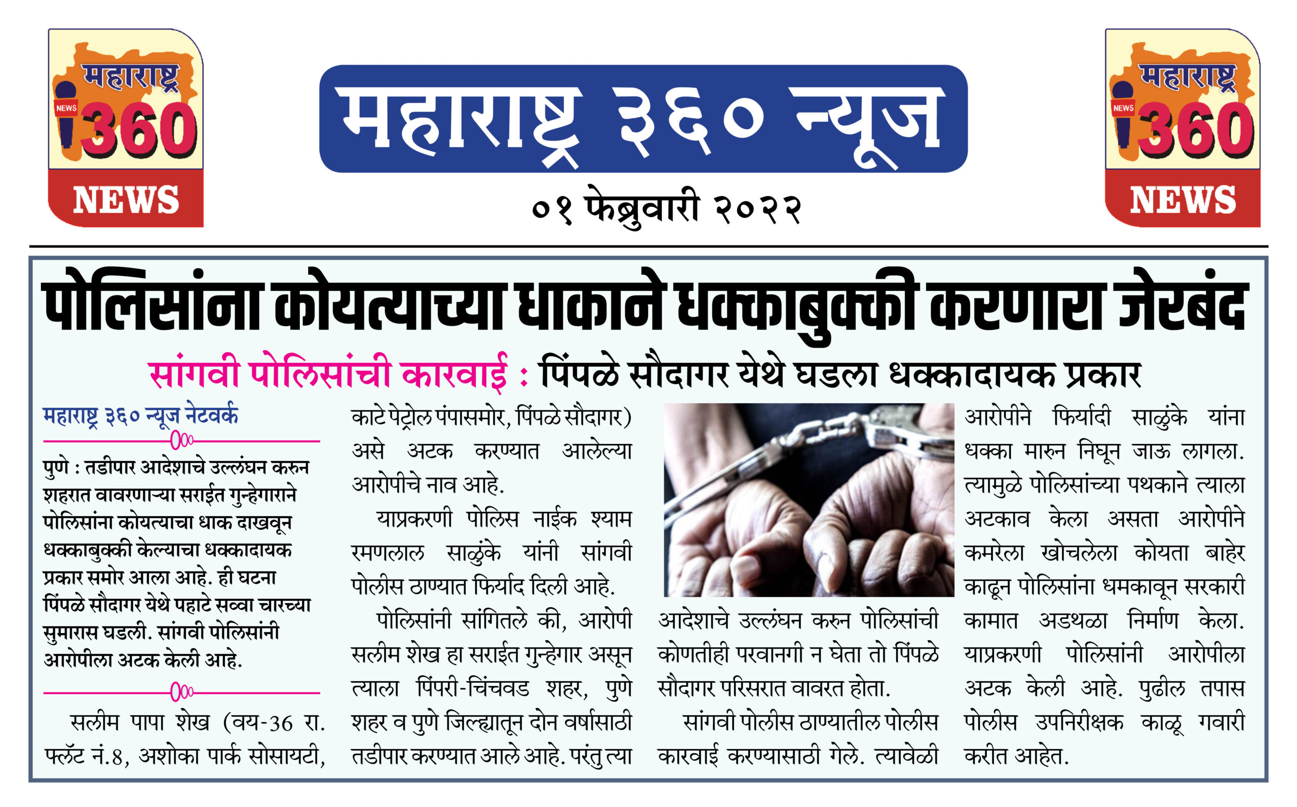सांगवी पोलीस ठाण्यातील पोलीस कारवाई करण्यासाठी गेले. त्यावेळी आरोपीने फिर्यादी साळुंके यांना धक्का मारुन निघून जाऊ लागला. त्यामुळे पोलिसांच्या पथकाने त्याला अटकाव केला असता आरोपीने कमरेला खोचलेला कोयता बाहेर काढून पोलिसांना धमकावून सरकारी कामात अडथळा निर्माण केला. याप्रकरणी पोलिसांनी आरोपीला अटक केली आहे. पुढील तपास पोलीस उपनिरीक्षक काळू गवारी करीत आहेत.