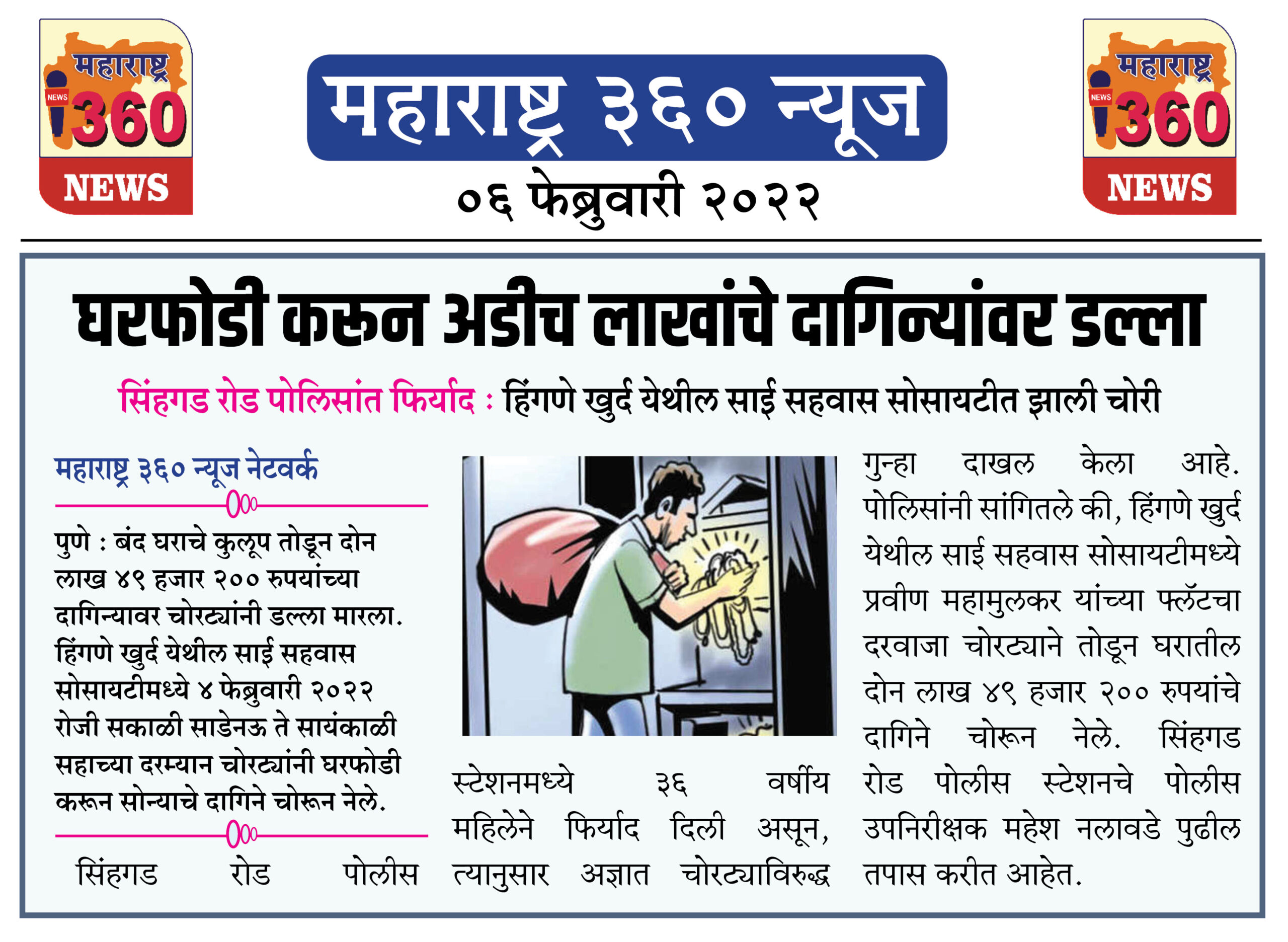 पोलिसांनी सांगितले की, हिंगणे खुर्द येथील साई सहवास सोसायटीमध्ये प्रवीण महामुलकर यांच्या फ्लॅटचा दरवाजा चोरट्याने तोडून घरातील दोन लाख ४९ हजार २०० रुपयांचे दागिने चोरून नेले. सिंहगड रोड पोलीस स्टेशनचे पोलीस उपनिरीक्षक महेश नलावडे पुढील तपास करीत आहेत.