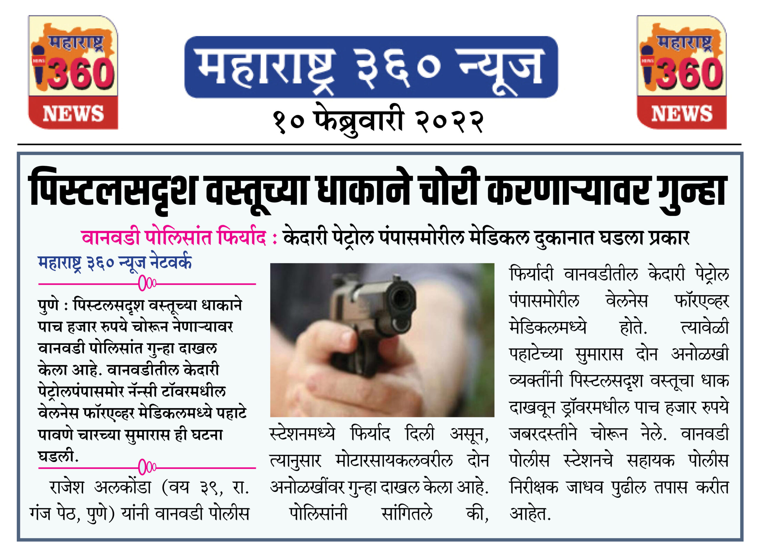 पुणे : पिस्टलसदृश वस्तूच्या धाकाने पाच हजार रुपये चोरून नेणाऱ्यावर वानवडी पोलिसांत गुन्हा दाखल केला आहे. वानवडीतील केदारी पेट्रोलपंपासमोर नॅन्सी टॉवरमधील वेलनेस फॉरएव्हर मेडिकलमध्ये पहाटे पावणे चारच्या सुमारास ही घटना घडली.
