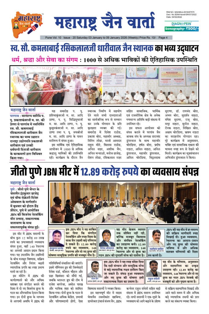 ← Back to Homepage Maharashtra Jain Warta 03 Jan To 09 Jan 2026 maharashtra jain warta • Maharashtra Jain Warta, MJW Weekly News • January 10, 2026 📥 Download News PDF महाराष्ट्र जैन वार्ता [dearpdf id=”42892″ ][/dearpdf]