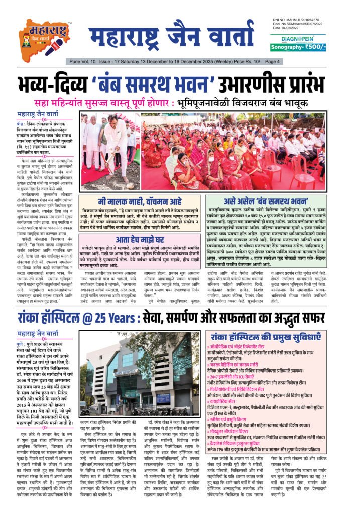 ← Back to Homepage Maharashtra Jain Warta 13 Dec to 19 Dec 2025 maharashtra jain warta • Maharashtra Jain Warta • January 5, 2026 📥 Download News PDF Spread the love महाराष्ट्र जैन वार्ता