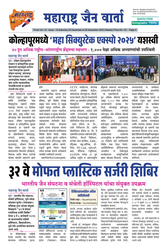 ← Back to Homepage Maharashtra Jain Warta 20 Dec to 26 Dec 2025 maharashtra jain warta • Maharashtra Jain Warta, MJW Weekly News • January 5, 2026 📥 Download News PDF महाराष्ट्र जैन वार्ता [dearpdf id=”42689″ ][/dearpdf]
