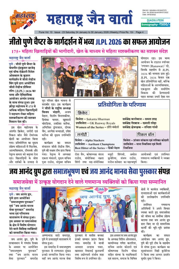 ← Back to Homepage Maharashtra Jain Warta Weekly 24 Jan To 30 Jan 2026 maharashtra jain warta • Maharashtra Jain Warta, MJW Weekly News, Social • February 23, 2026 📥 Download News PDF महाराष्ट्र जैन वार्ता [dearpdf id=”44035″ ][/dearpdf]