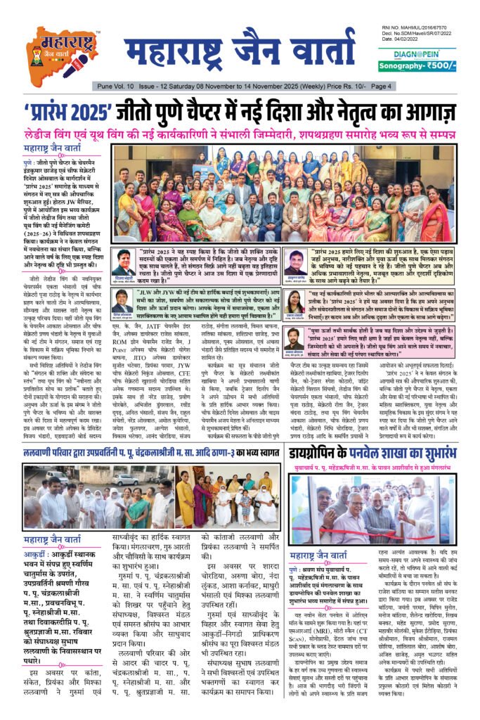 ← Back to Homepage Maharashtra Jain Warta Weekly E Paper 08 November To 14 November 2025 maharashtra jain warta • Maharashtra Jain Warta, MJW Weekly News • December 1, 2025 📥 Download News PDF महाराष्ट्र जैन वार्ता [dearpdf id=”41555″ ][/dearpdf]