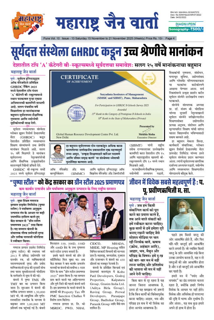 ← Back to Homepage Maharashtra Jain Warta Weekly E Paper 15 November To 21 November 2025 maharashtra jain warta • Maharashtra Jain Warta, MJW Weekly News • December 1, 2025 📥 Download News PDF महाराष्ट्र जैन वार्ता [dearpdf id=”41561″ ][/dearpdf]
