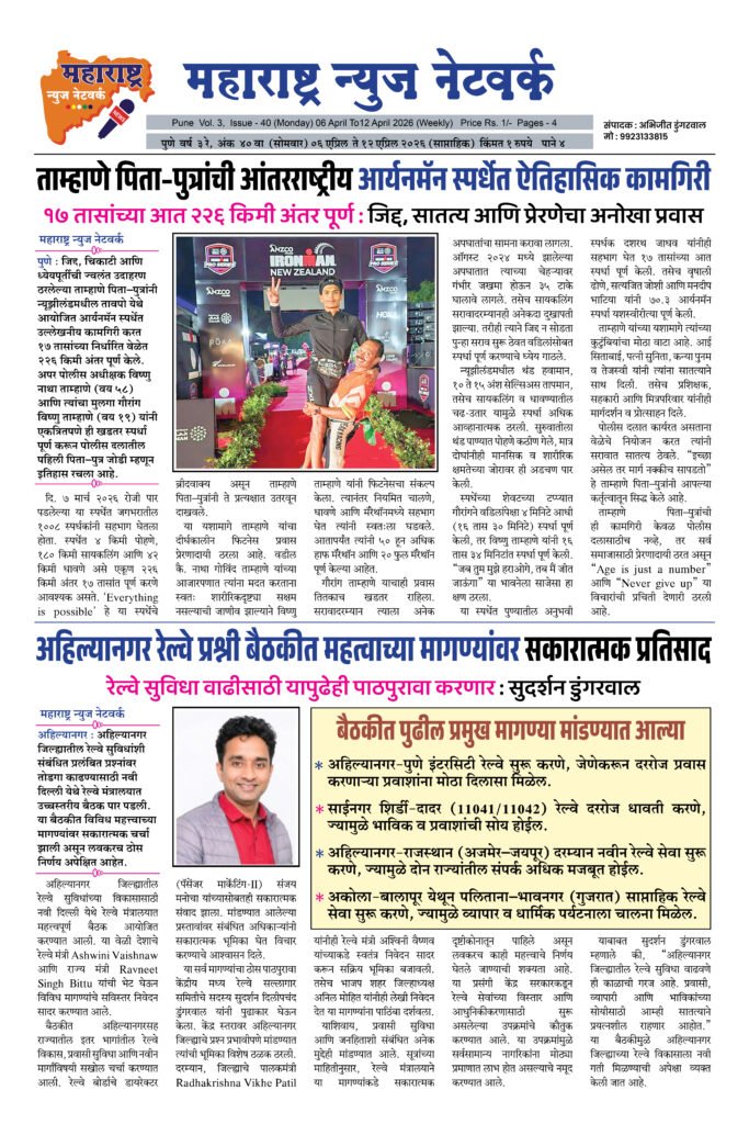 ← Back to Homepage Maharashtra News Network Weekly 06 AprilTo 12 April 2026 maharashtra jain warta • Maharashtra News Networks, MNN - Weekly Issue, Social • April 20, 2026 📥 Download News PDF महाराष्ट्र न्यूज नेटवर्क [dearpdf id=”45649″ ][/dearpdf]